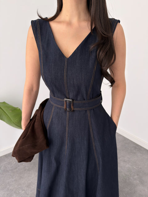 BEL DETAY DRAPELİ TAFTA ELBİSE SARI
