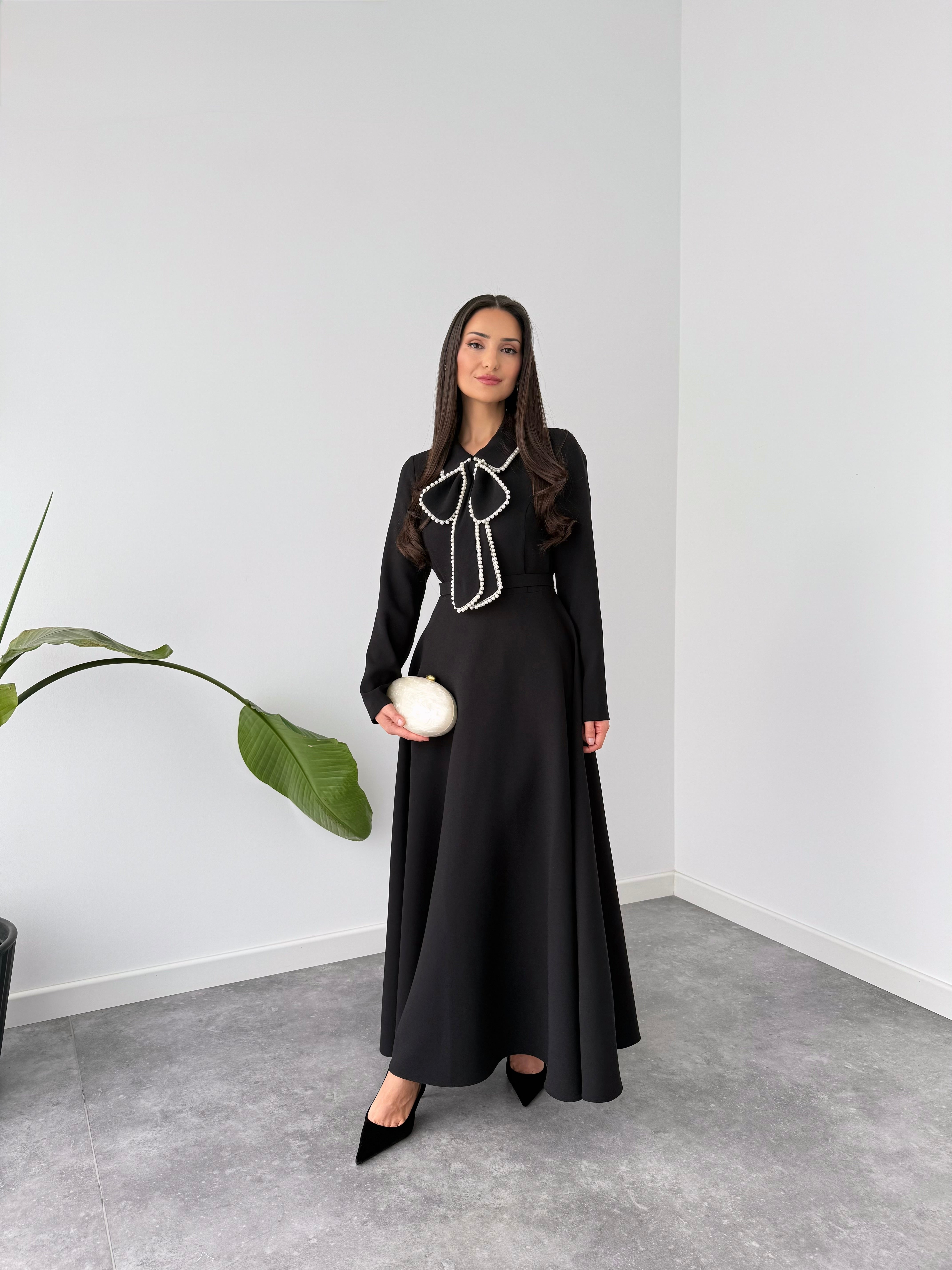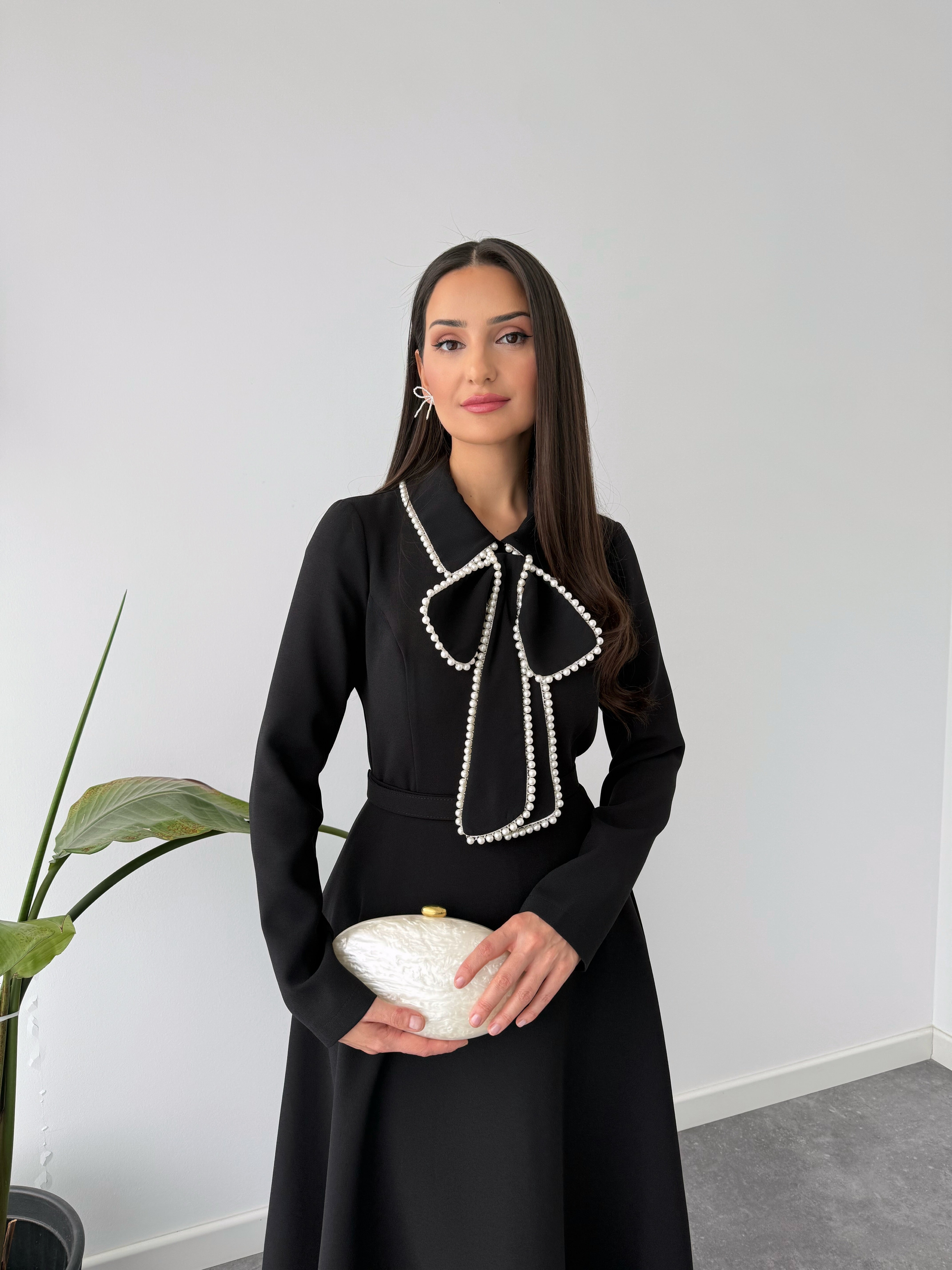 YAKASI İNCİ İŞLEMELİ ETEĞİ ASİMETRİK ELBİSE SİYAH