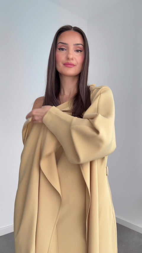 BOYUNDAN ŞAL DETAY BELİ KEMERLİ MAKSİ BOY ELBİSE SARI