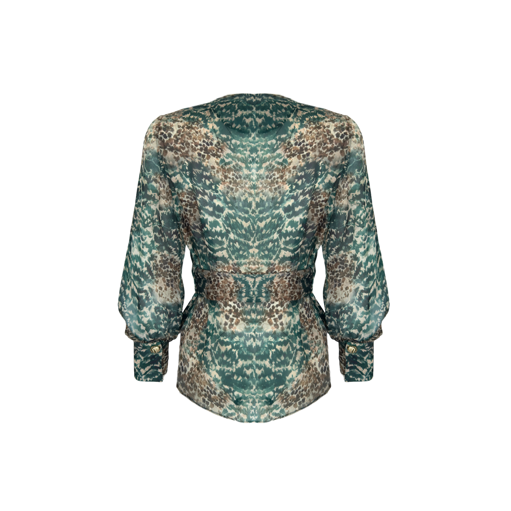 LEOPAR DESEN KRUVAZE BAĞLAMALI ŞİFON BLUZ YEŞİL