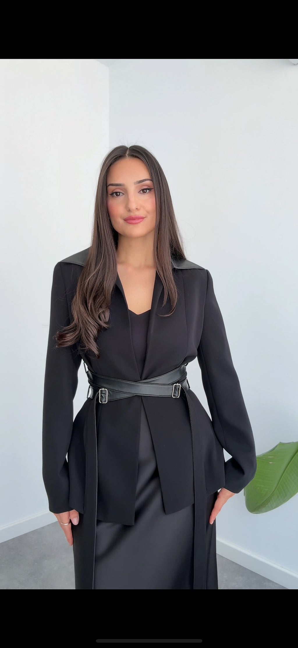 DERİ YAKA VE KEMER DETAYLI CEKET SİYAH