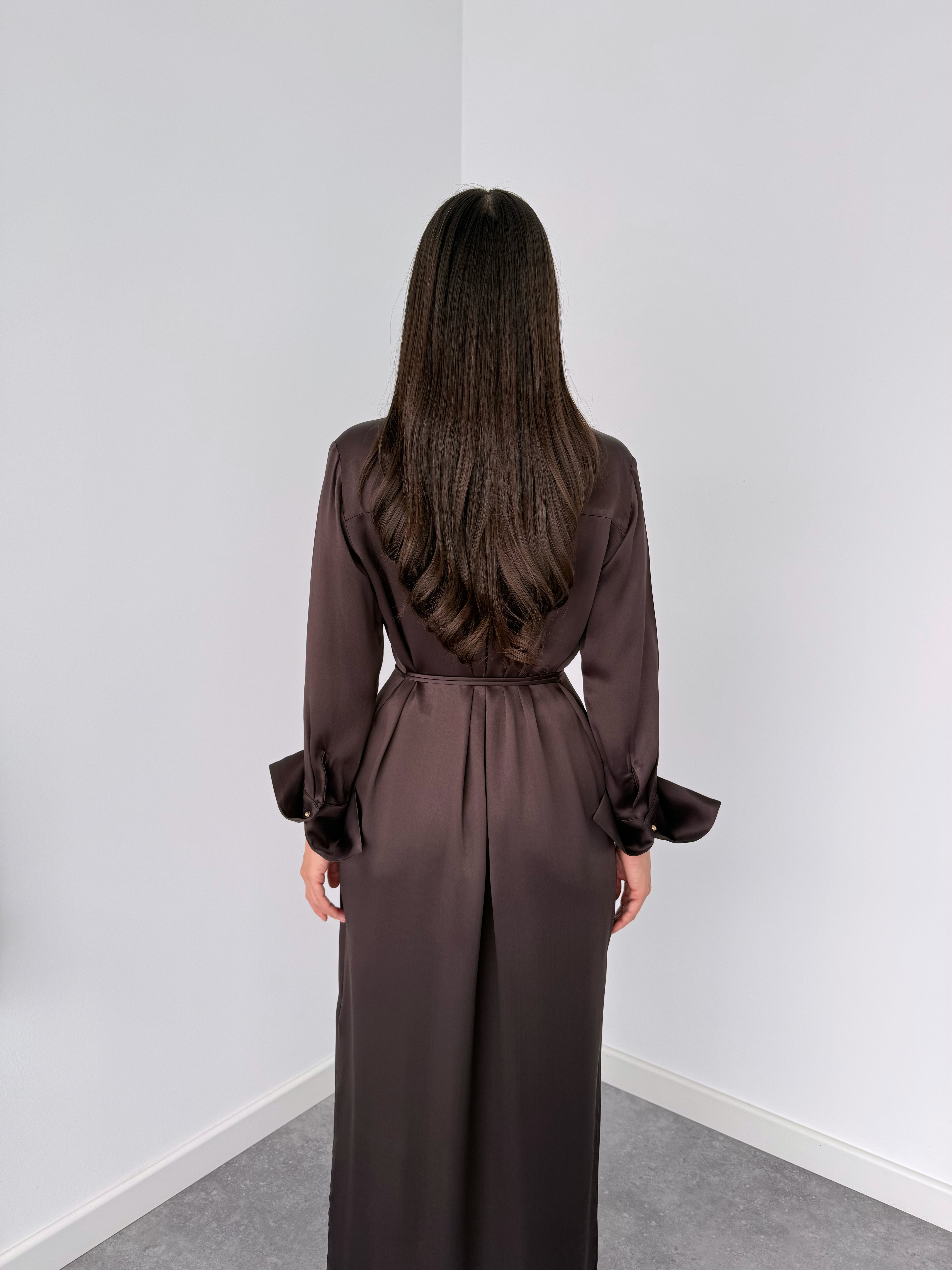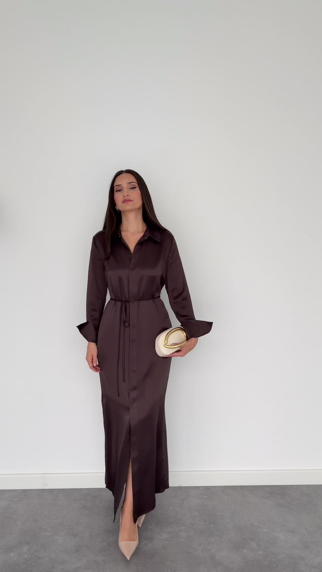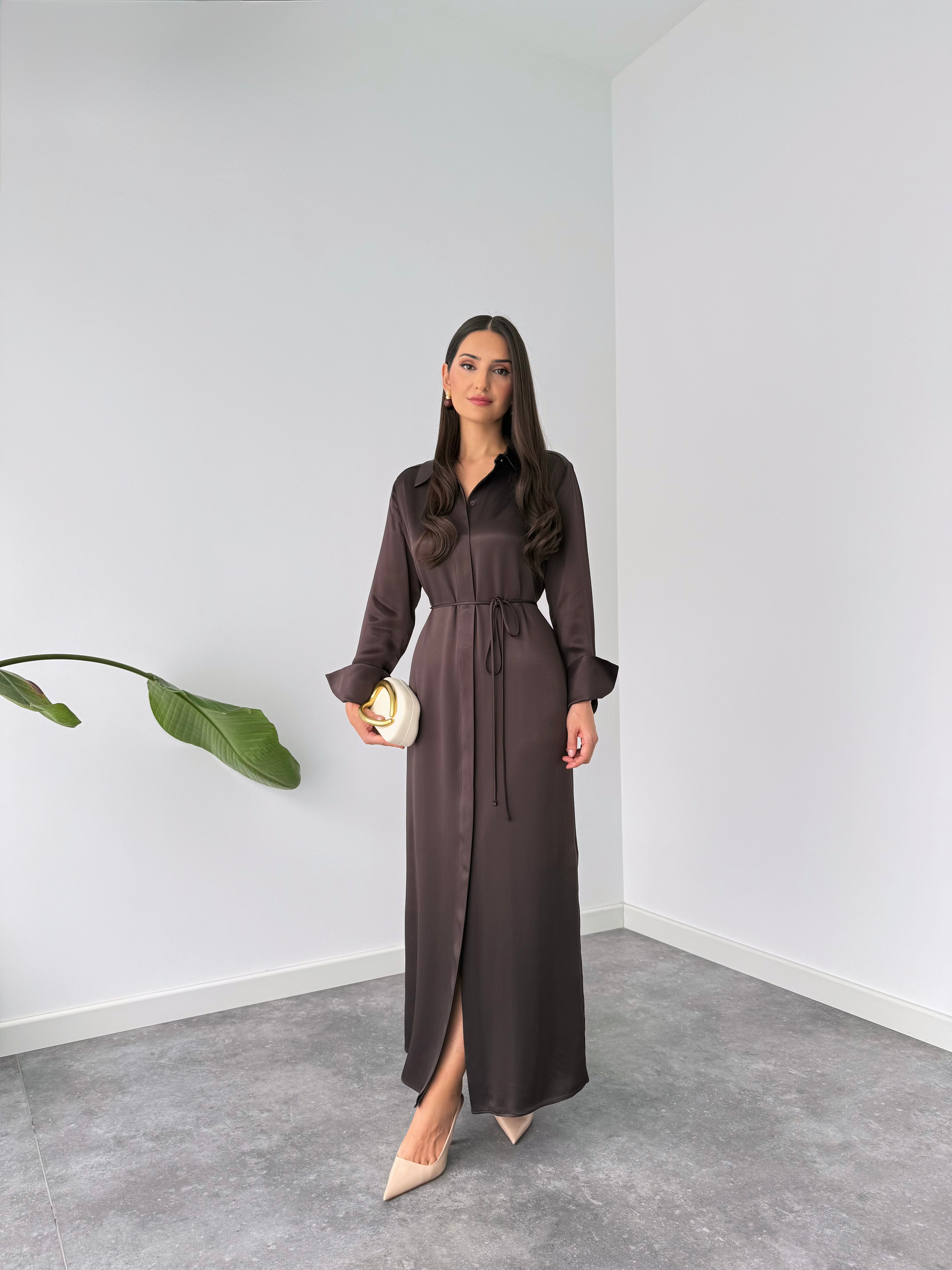 %100 RAYON SATEN IŞILTILI MAKSİ BOY GÖMLEK ELBİSE KAHVE