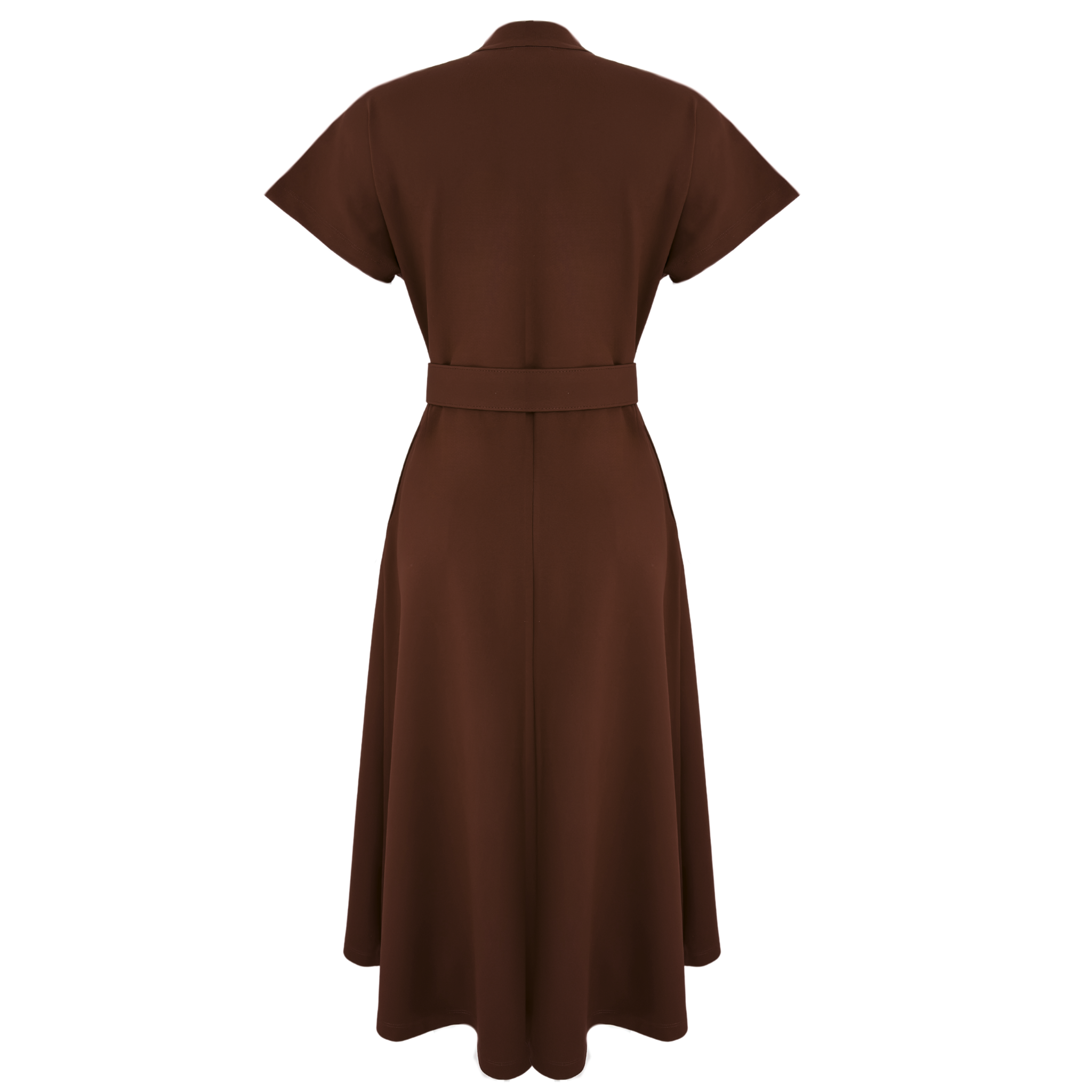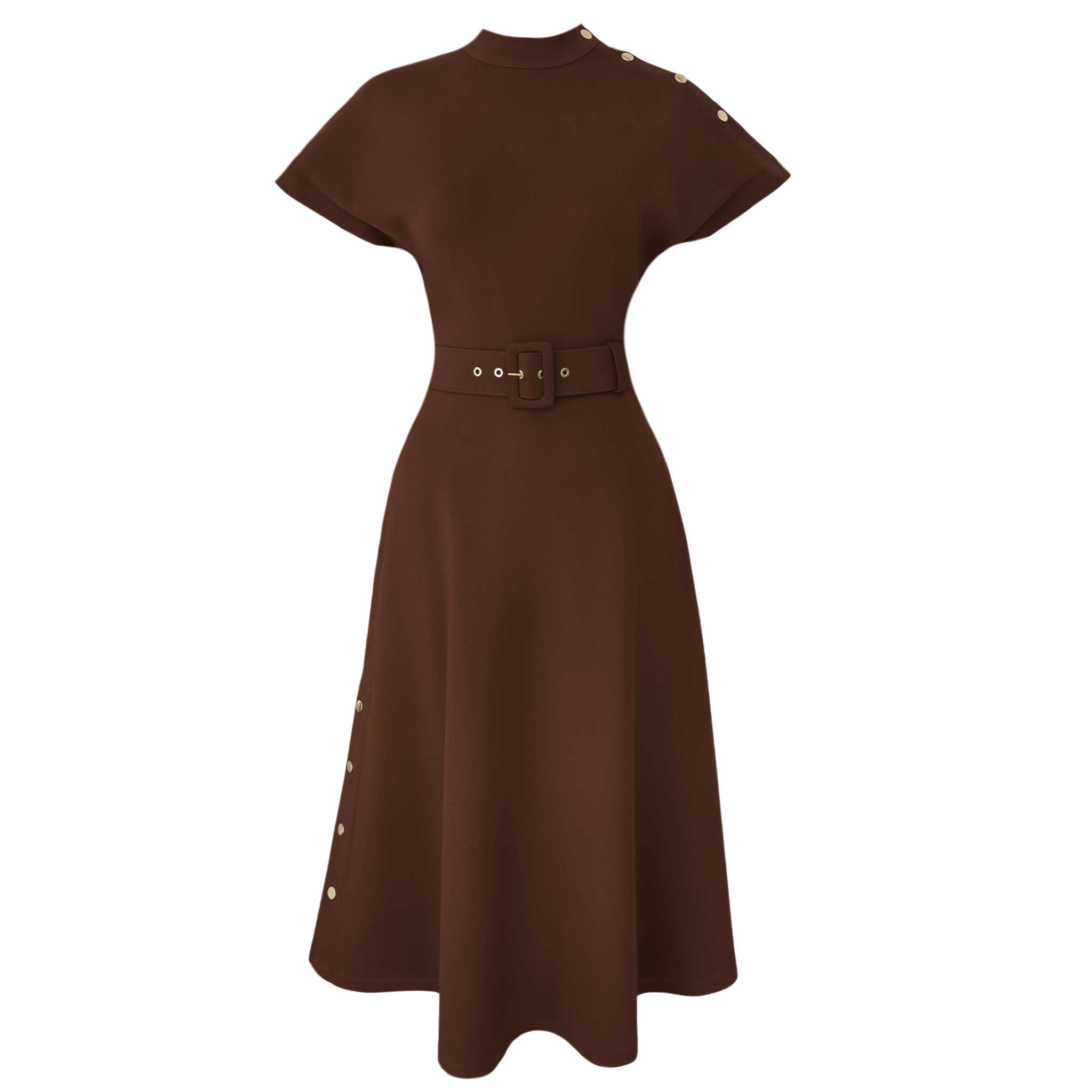 OMZU VE ETEĞİ GOLD DÜĞME DETAYLI ELBİSE KAHVE