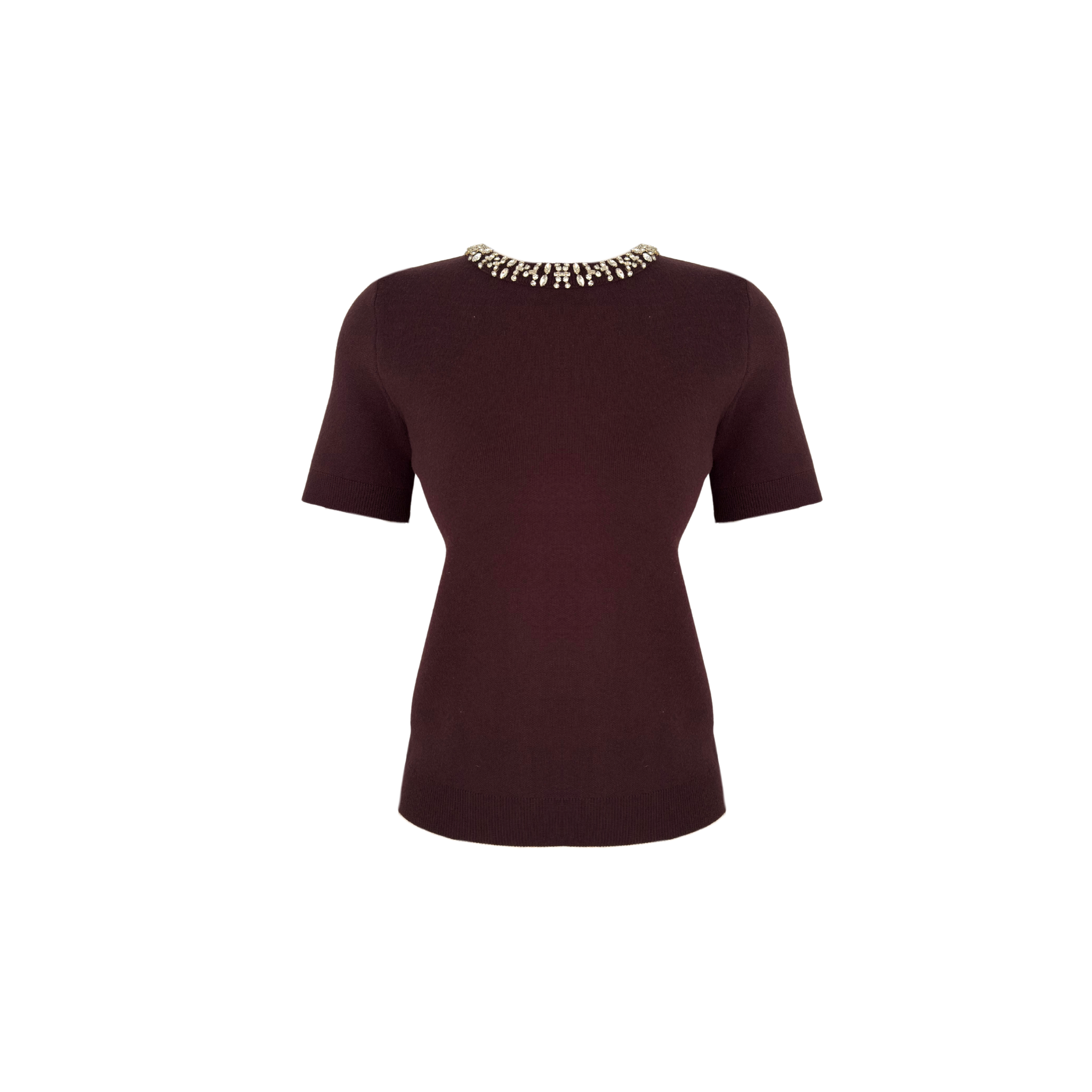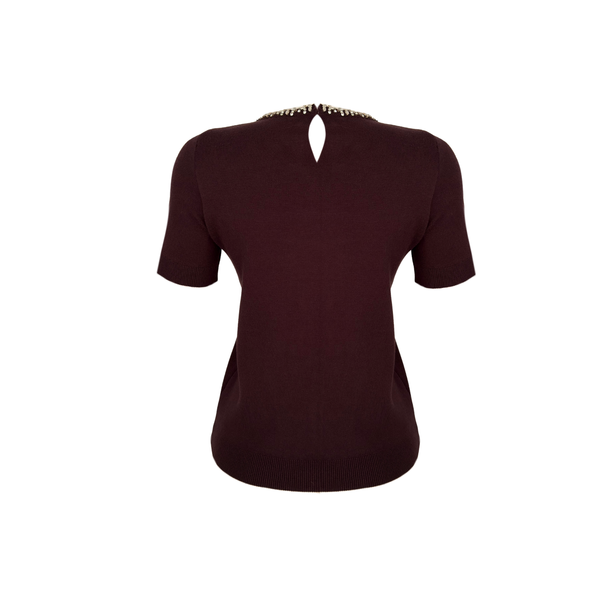 YAKASI TAŞ İŞLEMELİ KISA KOL TRİKO KOYU KAHVE